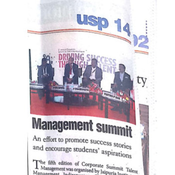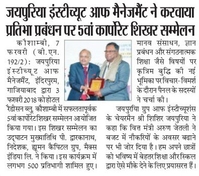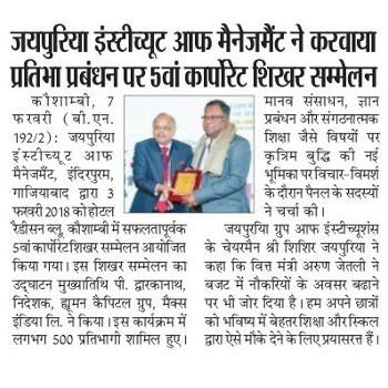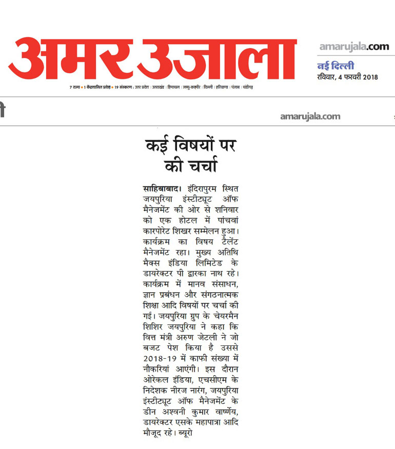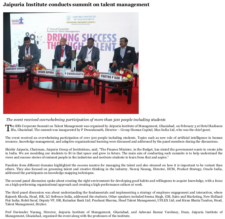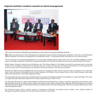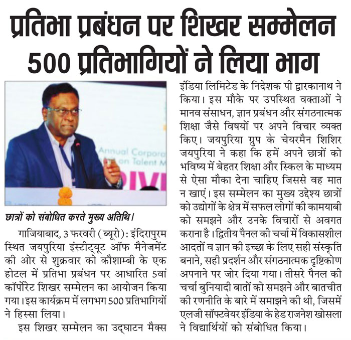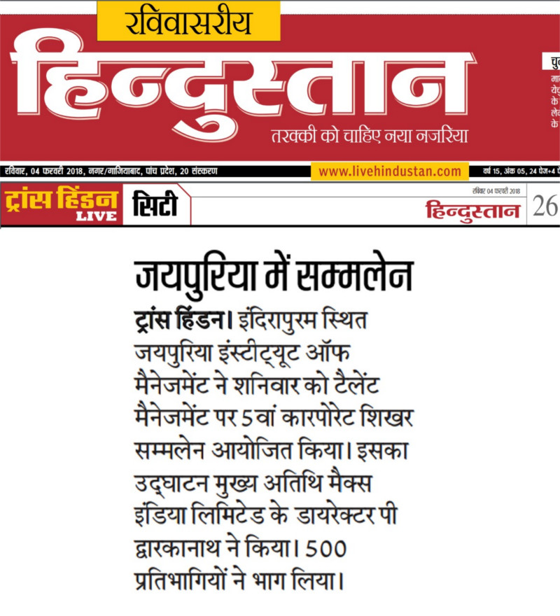 With an aim to provide a platform for sharing best practices, insights and industry experiences, the 5th Corporate Summit on “Talent Management: Driving Success Through Talent”was hosted by Jaipuria Institute of Management, Indirapuram, Ghaziabad on 3rd February, 2018 at Hotel Radisson Blu, Kaushambi, Ghaziabad. The Corporate Summit is a flagship event of the Institute. This annual summit is overseen by 500+ participants through 3 sessions taken up by 15+ speakers.